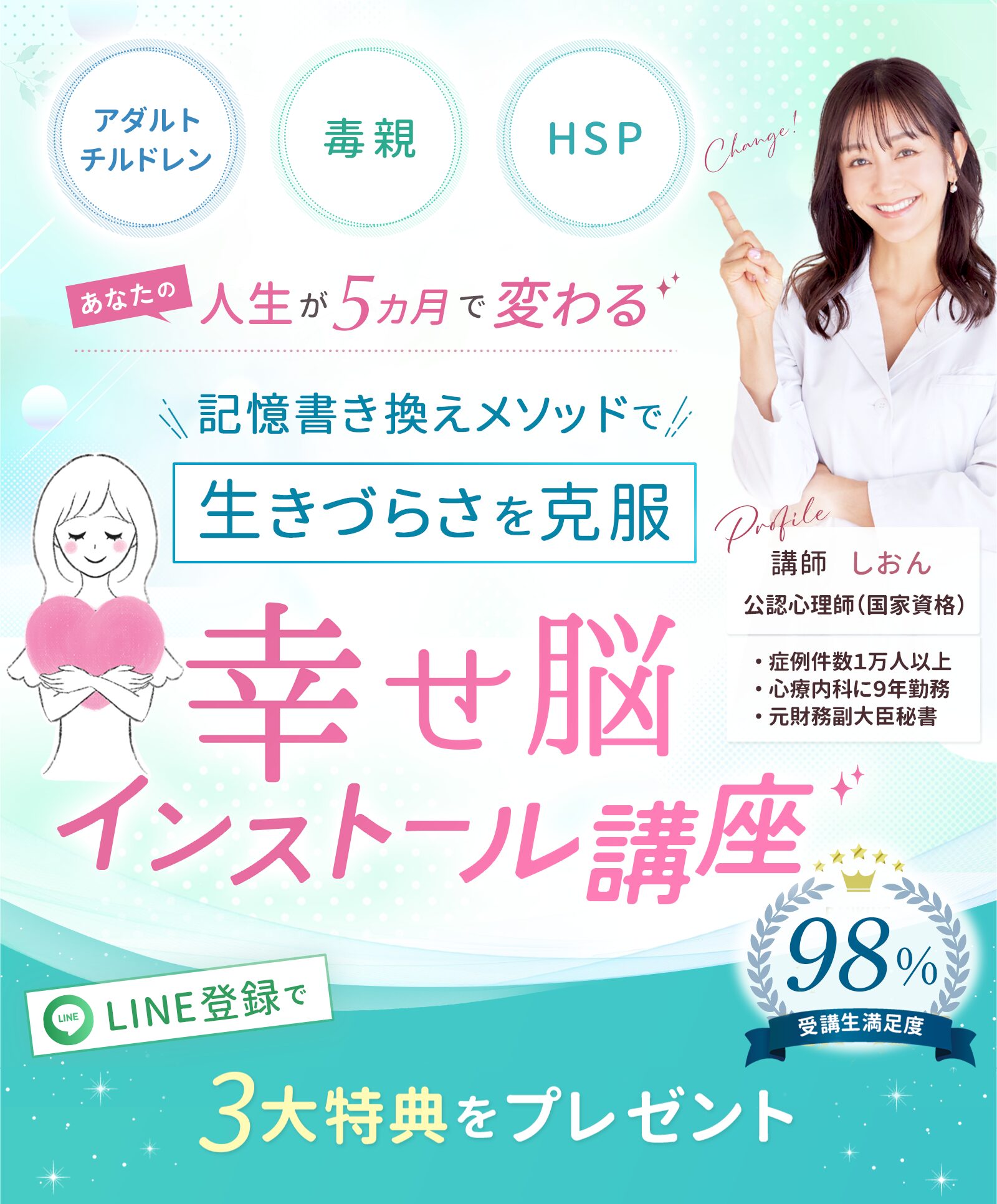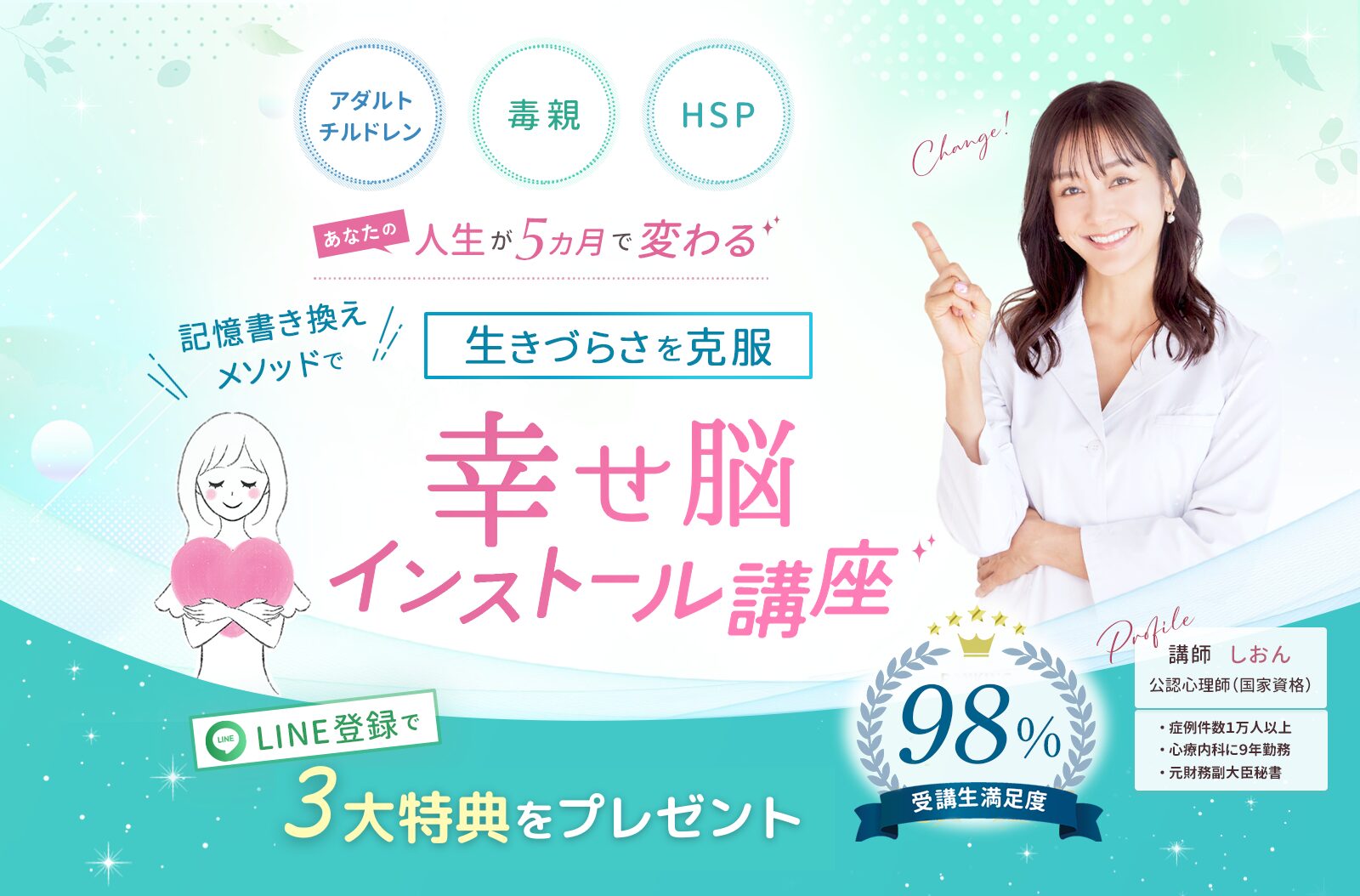 「幸せ脳」とは、あなたを生きづらくしている「考え方の癖」や「過去のツラい記憶」、「苦しいパターン」を手放し、「誰もが本来持っている“幸せになる力”を、自分自身のために使うことができる状態」のことです。 5か月の講座を通して「あたま・こころ・からだ」へのアプローチを繰り返し行い幸せ脳に変化できる設計をしています。